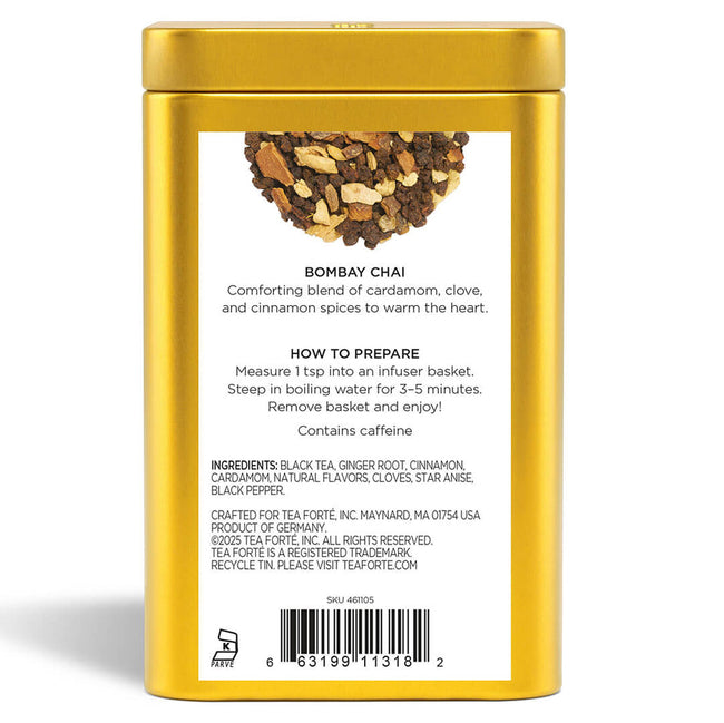 ジンジャー、シナモン、カルダモン、クローブ、スターアニス、ブラックペッパーなどの素晴らしく繊細なマリアージュによって、ティーフォルテのチャイティーに際立った特徴を与えています。この紅茶は「とても寛容な紅茶」として知られいます。なぜなら、濃くなり過ぎるということがほぼ不可能だからです。ボンベイ チャイは、伝統的なインドのマサラ チャイに含まれるスパイスと紅茶葉を組み合わせたものです。チャイのレシピは非常に幅広く存在します。さまざまなスパイス、砂糖、ミルクの量や種類を用います。ただし、どのレシピにも共通するのは、いずれも薄められ甘いということです。
