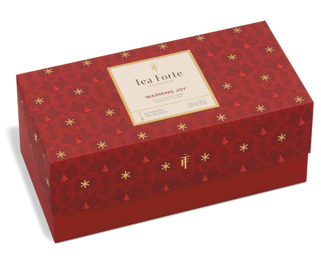 今冬のウォーミングジョイは赤を基調に金の星をちりばめたデザイン。ホリデーシーズンを艶やかに演出してくれます。心身共に温まる限定フレーバーを5種類、計20個のティーインフューザーを詰め合わせました。